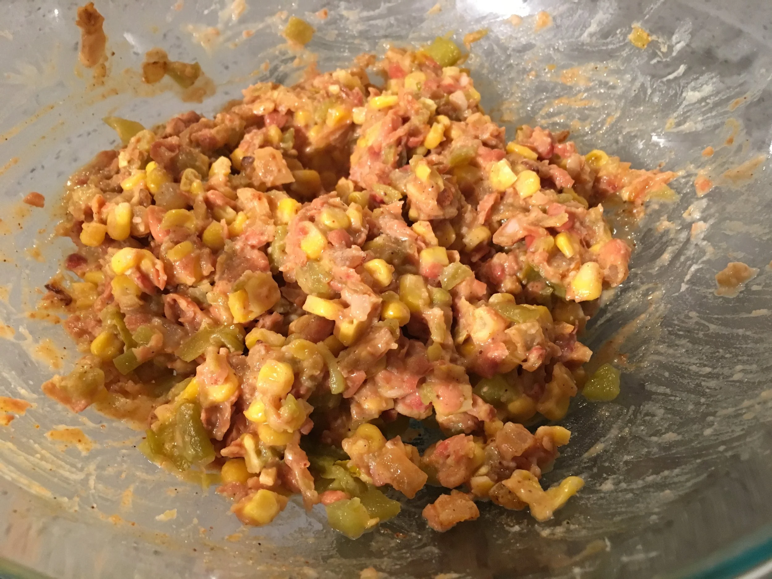 Put the beans, chiles, and lime juice in a bowl and mash. Keep mashing until you form a paste. Mix in the cooked onions and spices and corn. (If using frozen corn make sure to thaw first)